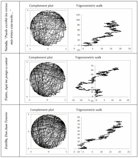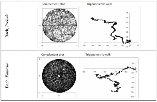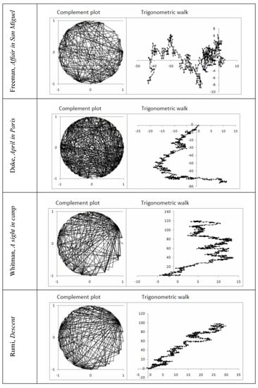 Complement plots (left) and trigonometric walks (right) of musical compositions and of poems.