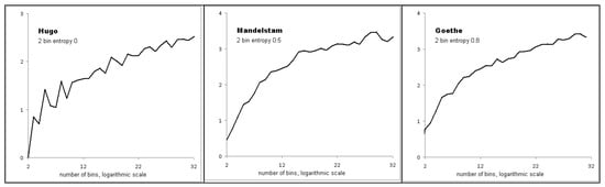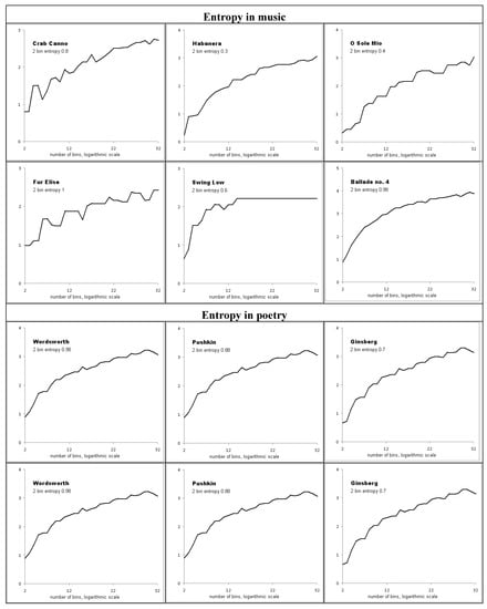 Entropy of musical compositions and of literary texts as a function of the number of bins. The musical compositions analyzed include: Eduardo di Capua’s O Sole Mio, Georges Bizet’s Habanera from Carmen, Bach’s Crab Canon, Mozart’s Fur Elise, the American Spiritual Swing Low Sweet Chariot, and Chopin’s Ballade no. 4. The poems are: Wordsworth’s Lines Written as a School Exercise at Hawkshead, Pushkin’s Eugene Onegin, Ginsberg’s Howl, Hugo’s A Sunset, Mandelstam’s Tristia, and Goethe’s To Luna.