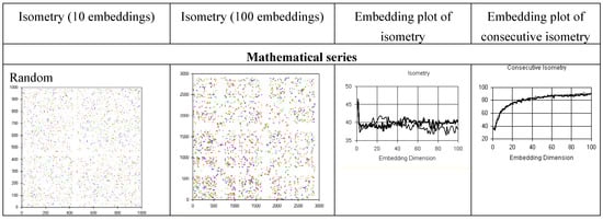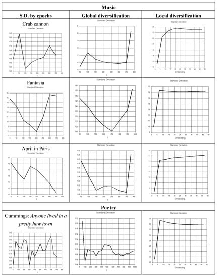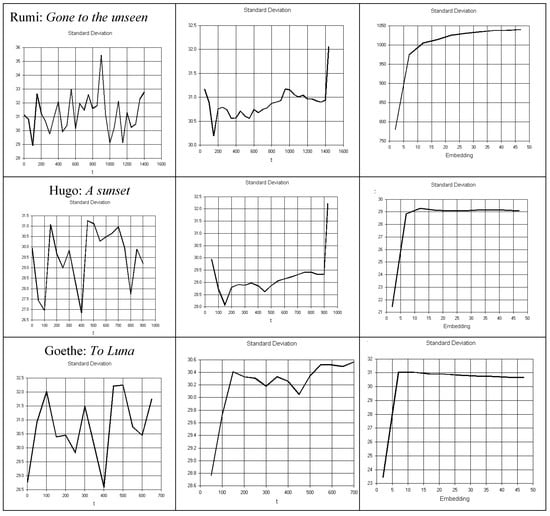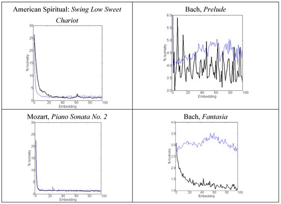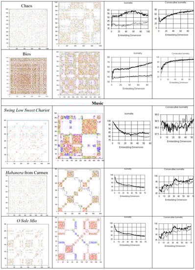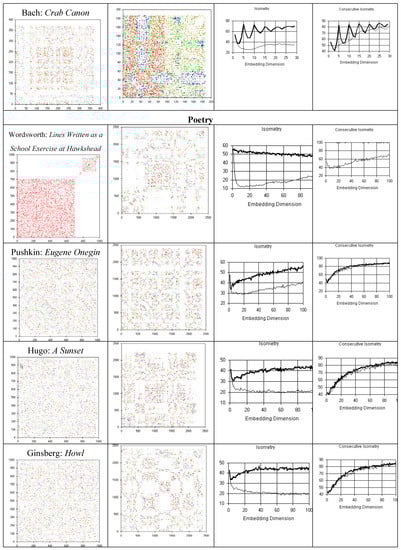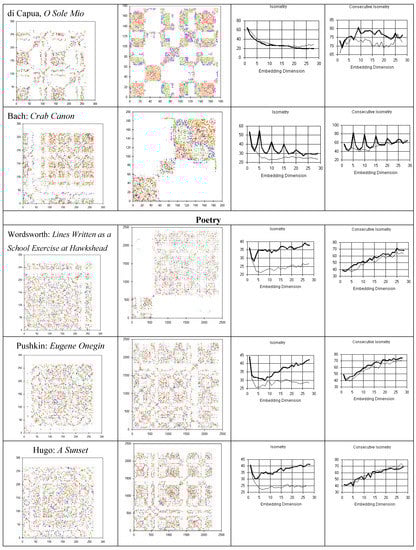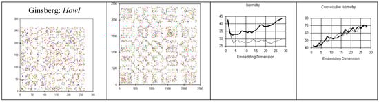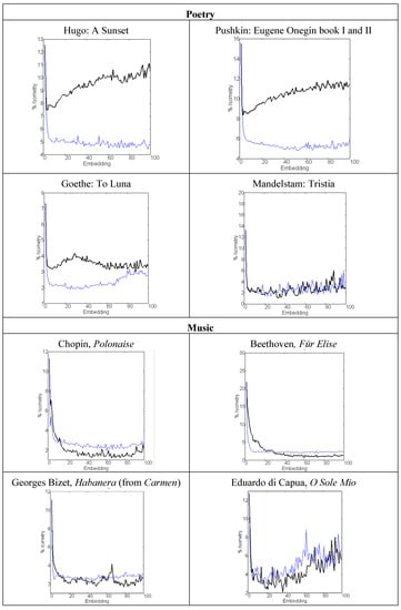 We analyze these musical and poetic texts with recurrence methods using the Bios Data Analyzer []. Given a series A1, A2, …, AN, we construct the sequences (Euclidean vectors) yi of N successive members of a time series [yi = (Ai, Ai+1, Ai+2, ..., At+N)] starting with each data point Ai:. This is referred to as embedding in dimension N. Recurrence isometries are calculated by comparing the Euclidean norms of these vectors, and if the difference between them is less than a chosen cutoff radius (1%), a recurrence is plotted and counted. We have made calculations with many cutoff radii, anging from 0.1 to 50 % and the reults are similar. The quantification of recurrences at low and high embeddings allows one to consider both simple and complex patterns. Recurrence plots graph isometries as a function of time. Recurrences are colored according to their distance from red to violet. Both types of recurrence generate the same pattern in recurrence plots, but the number of isometries increases and the number of similarity recurrences decreases with the length of the vector. Isometry is the number of isometric recurrences as a percentage of the total number of possible recurrences in the sample (N x N / 2). The number of isometries (as % of the total number of possible recurrences) is computed for the original data and for a copy of the data randomized by shuffling. Novelty is defined as the increase in recurrence isometry produced by shuffling the data [,], and is quantified as the ratio of isometries after shuffling over isometries in the original data. Novelty is a key measure to distinguish creative from non-creative processes. Novelty is demonstrable for recurrence isometry but not for similarity recurrence. Embedding plots present the value of novelty computed with 2, 3, …, 100 embeddings.
