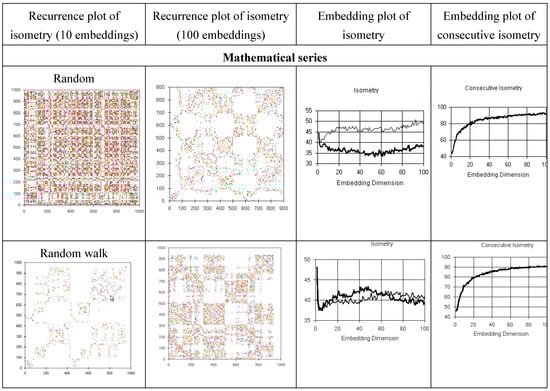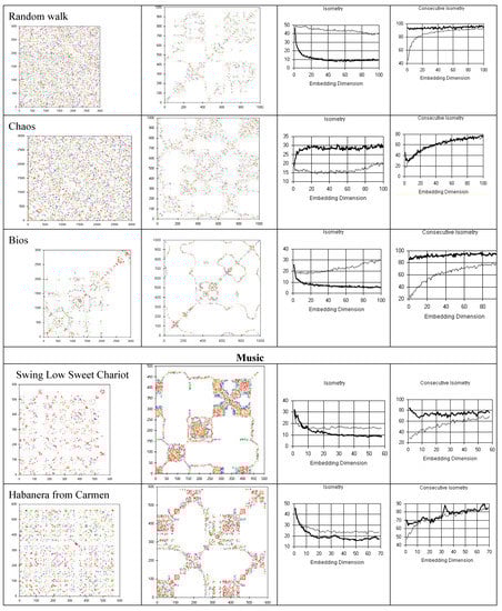 Isometry quantification (figure 10) demonstrates less recurrence (novelty) in many musical pieces, Bios, and random walks than in randomized copies, and more recurrences in many literary texts and in stationary chaos than in randomized copies.