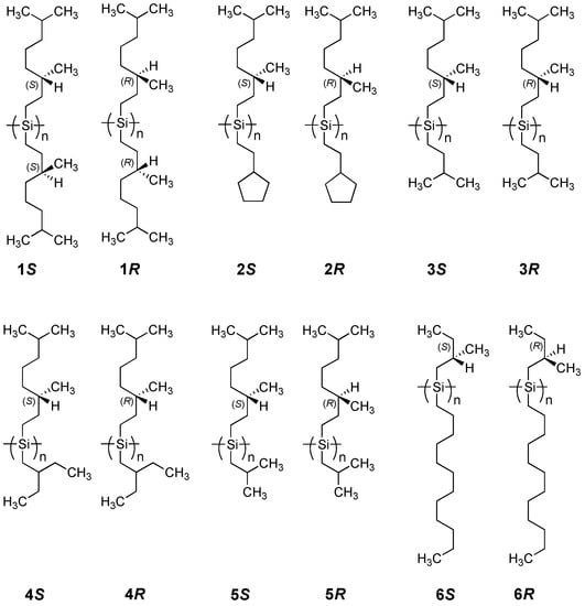 Although conclusive results using common chemical substances and apparatuses have not yet been reported, these modern MPV theories and current experimental reports, though still controversial, stimulated the author to revisit the equality and inequality of several ambidextrous artificial helical Si–Si bonded polymer–polysilanes–in solution as a function of temperature [,]. In a previous communication, the author reported preliminary testing results, implicating a possibility of detecting subtle differences in chiroptical and achiral 29Si-NMR and viscometric data for a pair of helical polysilanes []. The present paper reported comprehensively the experimental tests of an equality and an inequality observed in chiroptical, 29Si-/13Si-NMR, and viscometric measurements for six pairs of helical polysilanes carrying ambidextrous chiral side groups.