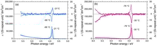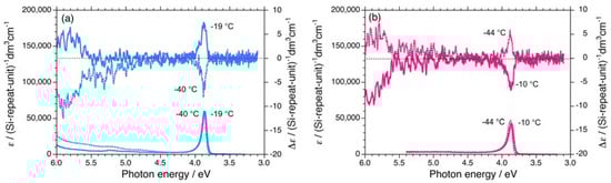 Three polysilanes (2S/2R, 3S/3R, 4S/4R) asymmetrically substituted with the chiral (S)-/(R)- 3,7-dimethyloctyl and the achiral cyclopentaneethyl, 3-methylpentyl, and 2-ethylbutyl side groups undergo helix-helix transitions in isooctane []. The Tcs of 2, 3, and 4 increase in the order of –33 °C, –22 °C, and –7 °C, respectively. The UV and CD spectra of 2S/2R, 3S/3R, and 4S/4R in isooctane below and above Tc are displayed in Figures 6(a)–6(b) and Appendix Figures A1(a)–1(d).