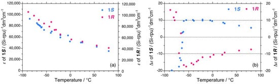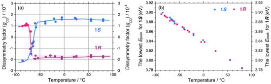 The magnitudes of the UV and CD signal intensities near 3.9 eV of 1S and 1R in isooctane as a function of temperature are shown in Figure 3. The UV intensities of 1S are somewhat weak compared to those of 1R in the range of –90 °C to +80 °C. However, the absolute magnitudes of the CD signals are intense in the negative CD region regardless of the side chirality and temperature.