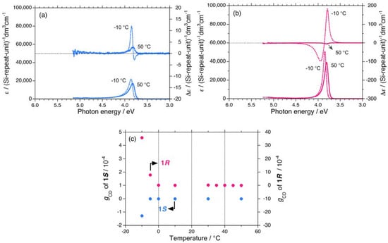 UV and CD spectra in chloroform of (a) 1S (Mw = 140,000, Mn = 34,400) at –10 °C and +50 °C, and (b) 1R (Mw = 149,000, Mn = 39,500) at –10 °C and +50 °C. (c) Apparent gCD values near 3.8 eV of 1S and 1R aggregates dispersed in chloroform as a function of temperature.