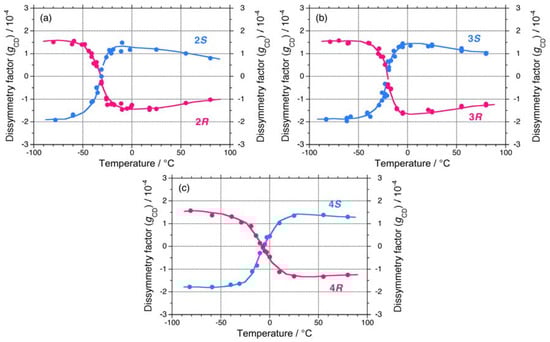 Apparent gCD values near 3.9 eV in isooctane as a function of temperature of (a) 2S (Mw = 93,100, Mn = 57,900) and 2R (Mw = 51,800, Mn = 25,200), (b) 3S (Mw = 232,000, Mn = 78,900) and 3R (Mw = 156,000, Mn = 76,800), and (c) 4S (Mw = 14,500, Mn = 11,300) and 4R (Mw = 19,000, Mn = 15,200).