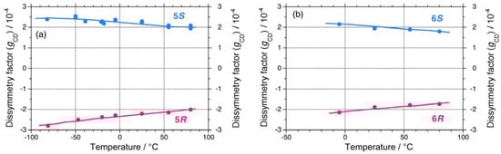 Apparent gCD values near 3.9 eV in isooctane as a function of temperature of (a) 5S (Mw = 42,300, Mn = 23,500) and 5R (Mw = 36,900, Mn = 19,000) and (b) 6S (Mw = 108,000, Mn = 37,300) and 6R (Mw = 80,900, Mn = 34,600).