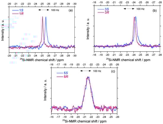 A solution NMR spectrometer is commonly used in chemistry and biochemistry laboratories as a typical achiral physical detection system for observing nuclear spin states surrounded by multiple electrons. Considerable differences in the 29Si-NMR spectral characteristics (chemical shift and linewidth) for helix-helix-transitioned 1S/1R and 3S/3R in CDCl3 were detectable, as shown in Figures 9(a)–9(b). By contrast, very weak differences for the non-helix-helix-transitioned 5S/5R pair were observed [Figure 9(c)].