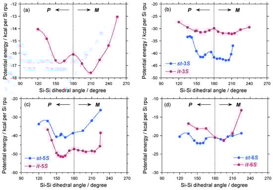The potential energy of (a) 1S with fifty Si-repeating units and hydrogen termini, (b) st- and it-3Ss with thirty Si-repeating units and hydrogen termini, and (c) st- and it-5Ss with thirty Si-repeating units and hydrogen termini, and (d) st- and it-6Ss with n-hexyl-(S)-2-methylsilane with thirty Si-repeating units and hydrogen termini calculated for simplicity. Here n-hexyl moiety was used in place of n-dodecyl group for simplicity.