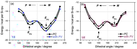 The potential energy of (a) 1S and (b) 1R with hypothetical corrections of EPV of +0.5 kcal for P- and –0.5 kcal for M-screw-senses for explanation purpose only.