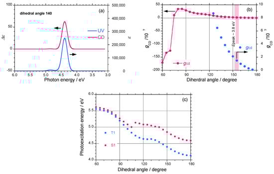 (a) Simulated UV and CD spectra of (SiH2)13 with a dihedral angle of P-140°, (b) simulated gCD as a function of the dihedral angle in H-(SiH2)13-H, (c) photoexcitation energies (singlet and triplet states) of H-(SiH2)13-H as a function of the dihedral angle.
