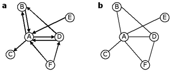 In the example shown in Figure 1a, vertex A has in-coming links and out-going links. Unfortunately, these commonly used quantities do not carry information about the reciprocity, since they do not tell us if the in-coming and out-going links of a vertex i ‘overlap’ completely, partly or not at all. As a way to measure the overlap between the sets of in-coming and out-going links of a vertex i, the reciprocated degree was defined [24,25,26,27] as the number of ‘reciprocal neighbours’ (vertices joined by two reciprocal links) of i: