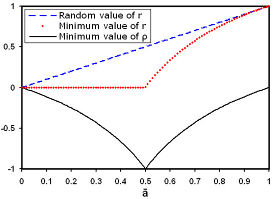 This seemingly puzzling outcome can be explained as follows. Note that Equation (21) implies that even in a network with the value of is always different from unless . This occurs because is the only case allowing perfect anticorrelation: in order to have whenever , the adjacency matrix must be exactly ‘half-filled’ with unit entries, and the number of links must be half the maximum possible one [24]. Remarkably, for there are two different cases. In the ‘sparse’ range , the minimum value of r is since it is always possible to place all the links without having reciprocal pairs. Consequently, Equation (21) implies that . By contrast, in the ‘dense’ range some links must be unavoidably placed between the same pairs of vertices and therefore . More precisely, since the number of vertex pairs is , the minimum number of reciprocal links is given by twice the number of links exceeding this number, or in other words . Consequently, and . Putting these results together, we have