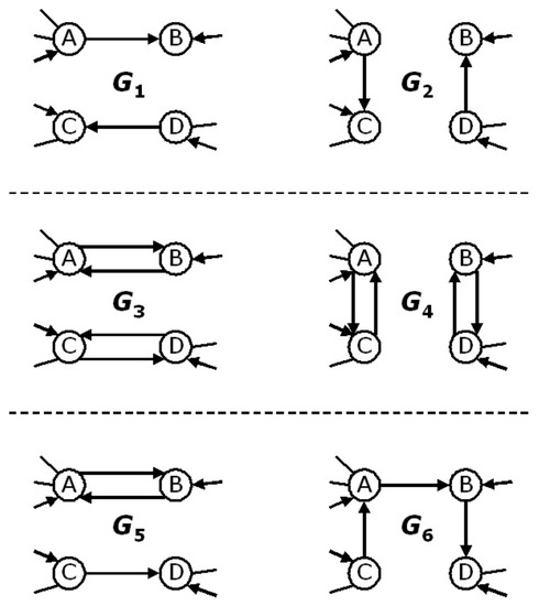 which is in an interesting relation with Equation (19). From the above equations, which can be checked explicitly in the example shown in Figure 1, it is clear that the knowledge of and is not enough to determine . Again, a crucial role is played by and consequently by the reciprocity of the network. For perfectly antireciprocal networks and , while for perfectly reciprocal ones . More in general, the knowledge of a directed topological property is not enough to determine the corresponding property in the projected undirected graph. The missing information is carried by the reciprocity structure of the network.