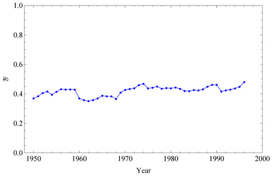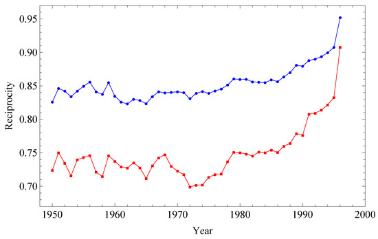 As clear from Equations (75) and (78), the proportionality constant between and is time-dependent. As Equation (79) indicates, this means that the reciprocity of the network must also change in time. In Figure 7 we show the empirical evolution of . Indeed, we find that the reciprocity of the WTW has evolved dramatically during the period considered. In particular, we see that has been fluctuating about a constant value from 1950 to the late 1970’s. Then, from the late 1970’s to the late 1990’s, a steady increase of took place. More importantly, this occurred despite the density of undirected trade relationships (the undirected connectance shown in Figure 4) remained approximately constant during the same period. This indicates that, from the late 1970’s on, there has been an establishment of many new directed trade relationships mainly between countries that had already been trading in the opposite direction, rather than between countries that had not been trading at all. That is, the reciprocation process of unidirectional trade channels has dominated the formation of new trade relationships between non-interacting countries.