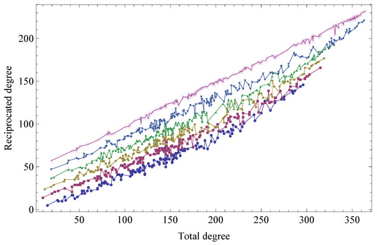 A second empirical result is that the reciprocated degree defined in Equation (27) is always proportional to the total degree , with a time-dependent proportionality coefficient [24,33]: