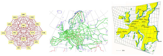 The above result is very instructive in the light of the relation between network structure and symmetry. What we should bear in mind, when we consider symmetry breaking in the field of network theory, is that symmetry (invariance) is hard to depict unless we use analytical tools. Our imagination, intended as the faculty of forming images, has been educated to depict shapes in Euclidean spaces. Whenever we must traduce shapes from Euclidean to topological spaces, we are inevitably biased by the fact the we tend to recall the Euclidean representation of forms in the new space. This overlapping of spaces generates misrepresentation. To better stress out the conundrum of spaces’ inequality representation, in Figure 6 we picture the trade network of Europe (EU-15), as it would appear in topological space (left panel) and in Euclidean space (middle panel), assuming that trades travel mainly on the road network [37]. While the Euclidean representation of the road network, except for the scale and a certain degree of abstraction, is conformal to the real system’s shape, the corresponding representation of the trade network in a metric space (the plane), is purely conventional. Indeed, we could have represented the same network in several different ways, e.g., arraying in a circle or randomly scattering nodes. We could actually produce ad libitum different Euclidean embeddings of the same graph. The topological-Euclidean dichotomy is further complicated by the fact the system represented by the WTW network is immersed in an economic space, involving variables and relations in large number, that are not detected in the network. Consider for example the traveling time of goods, which is determined by several exogenous factors. Traveling time, together with energy efficiency and labor costs, is among the major factors affecting shipping costs. In the right panel of Figure 6 we show a ‘metric representation’ of the space modification due to traveling time [38]. It is noteworthy that in an economic space distances are not merely Euclidean and the compound metric is made by length, time, labor costs and energy units at the minimum.