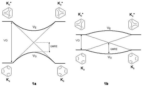 Following early recognitions of the propensity of electrons to distortivity [18,45], the rather surprising statement was advanced in a series of important papers [17,46,47,48,49,50,51,52,53]. The delocalized structure of benzene was seen as intermediate configuration between the localized and structures in the bond exchange process along the distortion mode where CC stretchings alternate with CC shrinkings. As illustrated in Figure 1, there are two possibilities for this process. On the left, the high energy gap between ground , and excited , states leads to localization of double bonds. If the gap is small as in Figure 1b, the delocalized geometry is preferred. The vertical gap () is related to the energy required to unpair the electrons, which is roughly three times the singlet-triplet excitation energy of the C=C system [49]. Then, a strong bond favors localization while a weak bond favors delocalization. Since the C=C bond is relatively strong it was concluded [48] that the electrons are distortive in benzene and that the crucial factor for symmetrization is the propensity to bond equalization.