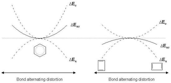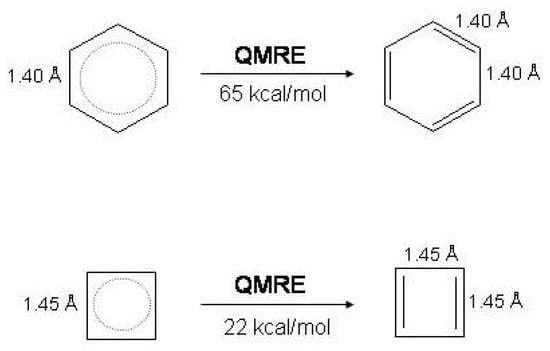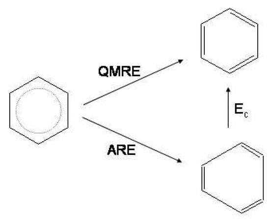 A second resonance energy is adiabatic () where the Kekule’ structures at the bond-equalized geometries are substituted by the optimized bond-alternating geometries in absence of all conjugation. Taking as example benzene in Figure 4, and are related according to the equation [58]