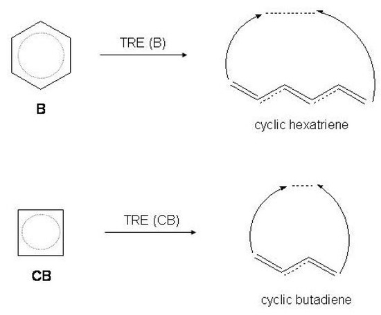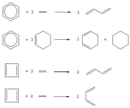 Empirical estimates of resonance energies are obtained by means of isodesmic and homodesmotic reactions [66,67] or heats of formation [68,69]. The isodesmic reaction + 6→ 3() + 3(), having equal numbers of formal single and double CC bonds in reactants and products, gives an approximate determination of () since it compares the energy of benzene with that of three ethylene molecules. In a homodesmotic reaction the previous condition is strengthened, further demanding for reactants and products equal numbers of (i) C atoms in the same hybridization state and (ii) and C atoms with one, two or three hydrogen atoms attached. Examples of homodesmotic reactions for benzene and cyclobutadienes are reported in Figure 6 where the cyclic standards are 3 and 2 molecules, respectively, of s-trans- or s-cis-butadiene.