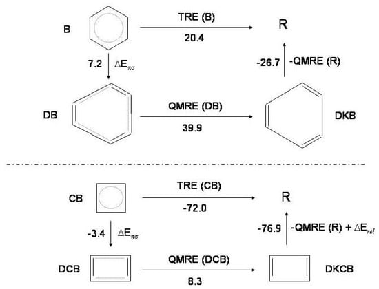 The thermochemical cycle for benzene (B, upper) and cyclobutadiene (, lower): distorted ; Kekule’ structures of distorted (see text for explanation of these acronyms); R reference molecule, cyclic hexatriene and cyclic butadiene. and : thermal and quantum mechanical resonance energies. : relaxation energy due to angle strain and overlap in cyclobutadiene; this term is not considered for benzene [17]. The energy values (kcal/mol) characterizing the thermochemical cycle of benzene and cyclobutadiene are indicated.