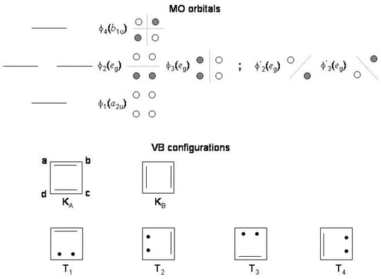 In the MO theory the four orbitals of square cyclobutadiene are classified into the , and symmetry species in order of increasing nodal planes [84,85]. All the MO’s are determined by symmetry with the two degenerate orbitals characterized by one nodal plane and distributed either over the whole ring, and , or, equivalently, localized on opposite ring atoms, and .