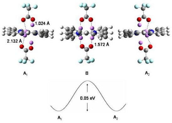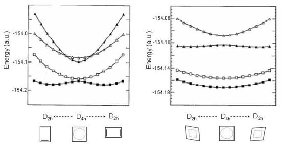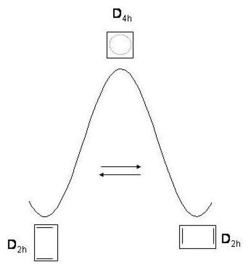 Molecular geometries of non-degenerate electronic states may be unstable due to coupling with higher excited states through non-totally symmetric distortions [42,43]. The effect has been called second-order (or vibronic) Jahn-Teller effect and is distinguished from the first-order effect, relative to degenerate states [95]. For instance, the 1 state of square cyclobutadiene couples with 1 when the molecule is distorted along the rectangular mode consisting of adjacent in- and out-of-phase CC bond stretchings around the ring. For a sufficiently strong coupling term the square () → rectangular () structural change occurs. The consequent state correlation is 1 1; 1 2. This process may be viewed also as a bond shifting reaction interconverting two equivalent structures (see Figure 9) through the transition structure of symmetry [87].