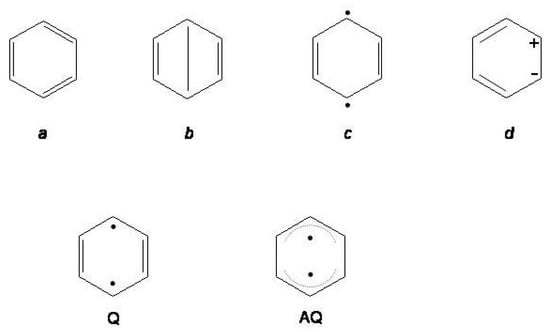 In order of increasing number of nodal planes the six orbitals of benzene are classified into the , , and symmetry species. The HOMO → LUMO excitation, i.e., , gives origin to six states, three singlets, , and , and three triplets, , and . In addition, both the and the promotions contribute to the and states. The energy level diagram established on the basis of the assignment of the observed excitation energies [35,127] is summarized in Table 7. All the excited state calculations [116,128,129,130,131,132] are consistent with the energy ordering and . From the point of view of the VB theory these states may be classified into two groups, covalent and ionic [128,129,133]. States with covalent character are , and described by Kekule’, Dewar and quinoidal structures a - c of Figure 11. Structures with charge separations [for instance, (d) in Figure 11] predominantly contribute to , and , thus imparting ionic character to these states [133]. The excitation energies to covalent states are fairly well reproduced even in less extended ab initio calculations while more sophisticated calculation methods are needed for the calculation of the excitation energies to ionic states [129].
