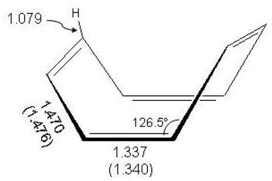 In the second, at the geometry, 39.9 kcal/mol [17]. The third step, from to the reference molecule, restores partially the -conjugation. Since of polyenes is found to be nearly additive, the resonance energy of the reference molecule, which is cyclic hexatriene, is 3/2 that of hexatriene, 26.7 kcal/mol [17]. Therefore, = −26.7 kcal/mol. Overall, = 20.4 kcal/mol, in agreement with the accepted value [4,68].