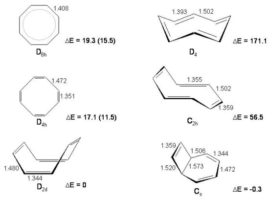 On the left, cyclooctatetraene and , transition states of and symmetry; on the right cyclooctatetraene isomers (crown, chair and bicyclo[4.2.0]octa-2,4,7-triene, , and symmetry, respectively). Structural parameters (Å) and energies (kcal/mol) relative to minimum, reported results [148] (MP2-CASSCF//CASSCF/6-31G* calculations). Experimental energy values (kcal/mol) of the and transition states are given in parentheses [151].