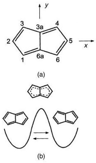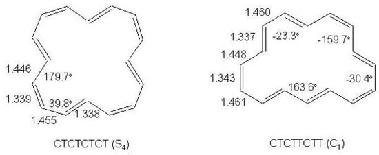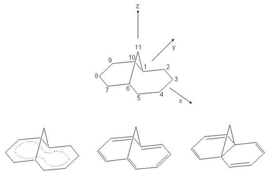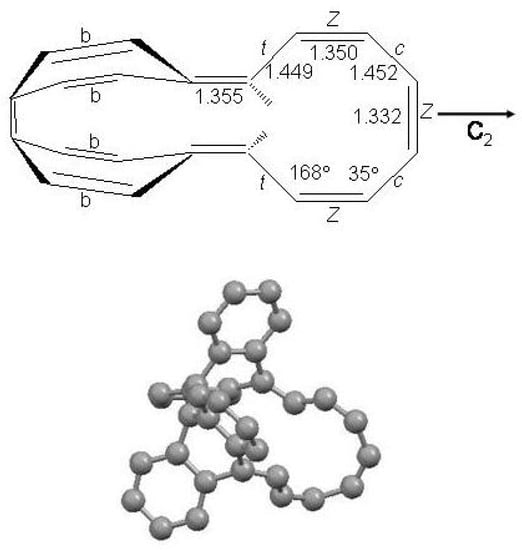 Due to angular strain cyclooctatetraene, the next higher homologue in the annulene series, is a non aromatic molecule with a non planar structural arrangement of four weakly interacting bonds [4,10,11]. It is known from electron [139,140,141] and X-ray diffraction [142,143] data and recent results of femtosecond spectroscopy [144] that the molecule adopts a tub-shaped structure of symmetry, as shown in Figure 12.