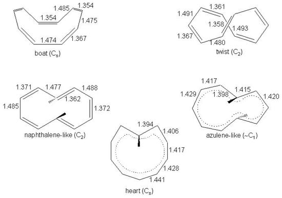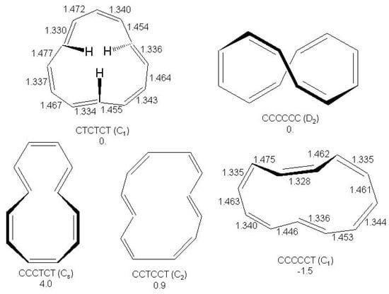 The structures and energies (relative to the tub minimum) of the and stationary points and of one selected isomer and two conformers (bicyclo[4.2.0]octa-2,4,7-triene, crown and chair; , and symmetry) are reported in Figure 14. The chair and crown conformers are stable species 56.5 and 171.1 kcal/mol above the tub conformation [148]. They are obtained from the tub by rotation of two and four CC double bonds so that the orbitals are directed toward the internal part of the cyclic structure, thus increasing the repulsion among electrons [148]. The tub and bicyclo isomers are only a small fraction of the total number of (CH) valence isomers, 21 including stereoisomers [149,150]. Disregarding H atoms, they correspond to regular graphs of degree three [150], i.e., their formulas are drawn under the condition that (i) three lines (bonds) always meet at each vertex (C atom) and (ii) no two of these lines cross. If these conditions are relaxed additional (CH) isomers can be derived.