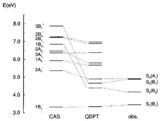 Finally, the mode, where one CC bond lengthens and the opposite shortens, may cause a square () → trapezoidal () distortion coupling 1, 1 and 1 with higher excited states. The state correlation is , ; , ; . However, with the states high in energy, the coupling is expected to be weak and a trapezoidal equilibrium geometry is not reached in any of these states [87]. By the same argument applied to 1 it follows that, due to the large energy gap with respect to the next nearest state, 1, the lowest triplet is stable toward trapezoidal and a fortiori all types of planar deformations [94]. The minimum structure of the 1 state in Table 5 is confirmed by the absence of imaginary frequencies in all ab initio vibrational calculations [89,90,91]. The square triplet structure of cyclobutadiene agrees with the reversal of the rule [22,101] according to which -electron rings with bond alternating geometry in the lowest singlet have bond equalized structures in the lowest triplet. Triplet aromaticity of cyclobutadiene and more in general of -electron annulenes up to the cyclononatetraenyl cation has been quantitatively estimated by high-level ab initio calculations in terms of aromatic stabilization energies and of geometric and magnetic properties [102].