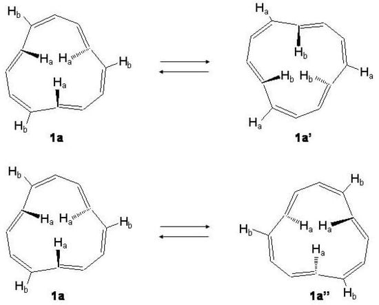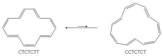 - Oth, J.F.M.; Gilles, J.M. Mobilite Conformationelle et Isomerie de Valence Rapide Reversible dans le [16]Annulene. Tetrahedron Lett. 1968, 6259–6264. [Google Scholar] [CrossRef]