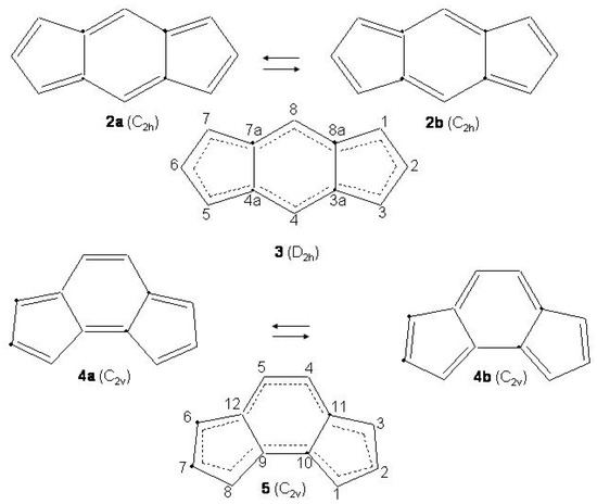 Monocycles with 4n electrons are the second large group of conjugated hydrocarbons, the antiaromatic systems [21,22], characterized by the instability with respect to acyclic polyenes and the tendency toward bond alternating geometries [4]. Cyclobutadiene has been considered the reference antiaromatic system [23,24] though recently criticism has been advanced to this view [25,26]. Going up with the ring size, while cyclooctatetraene is characterized by a non planar arrangement of the four bonds [4,10,11], pentalene, where the ring is forced to planarity by crosslink [27,28], is equally well suited to model antiaromatic properties [29]. On the contrary, the more complex and formally antiaromatic structure of s-indacene peculiarly shows a bond equalized ring geometry [30,31].