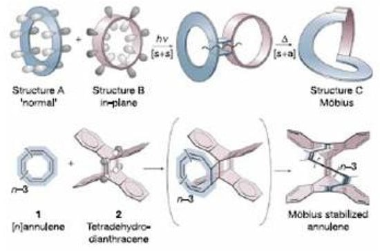 - Martin-Santamaria, S.; Lavan, B.; Rzepa, H.S. Hückel and Möbius Aromaticity and Trimerous Transition State Behaviour in the Pericyclic Reactions of [10], [14], [16] and [18]Annulenes. J. Chem. Soc., Perkin Trans. 2000, 2, 1415–1417. [Google Scholar] [CrossRef]