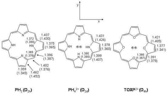 - Jelovica, I.; Moroni, L.; Gellini, C.; Salvi, P.R.; Orlic, N. Structural and Vibrational Properties of Tetraoxaporphyrin Dication, the Oxygen Analogue of Porphyrin, and of Isoelectronic Diprotonated Porphyrin. J. Phys. Chem. A 2005, 109, 9935–9944. [Google Scholar] [CrossRef] [PubMed]