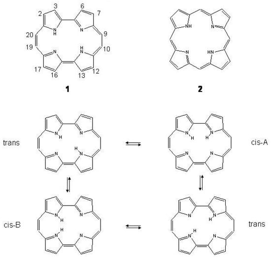 - Ghosh, A.; Almlöf, J. Structure and Stability of cis-Porphyrin. J. Phys. Chem. 1995, 99, 1073–1075. [Google Scholar] [CrossRef]