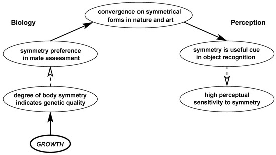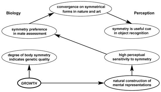 This argument, however, ignores that the symmetry preference already requires a high perceptual sensitivity to symmetry. Therefore, Figure 2 provides an alternative argument, which does not deny the evolutionary relevance of the just-mentioned factors, but which proposes clearer causal relationships. This argument starts from growth as a fundamental natural force towards order, which forms a balance against the also-natural force towards chaos [28]. By this, I do not mean that growth should be considered to be distinct from other physical or biochemical processes (a quite common idea in the 19th century). Instead, I simply mean that natural growth processes are responsible for virtually all symmetrical shapes in nature, be they crystals or living organisms. As I argue later in this article, growth may also reflect the way in which visual systems build structured mental representations. This suggests not only that fluctuating asymmetry may indeed be a marker of quality, but independently thereof, also that the natural principle of growth gave rise to visual systems that are pre-eminently suited to process symmetry.