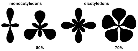 In the plant family of monocotyledons, 80% of the mostly 2-fold and 3-fold symmetrical flowers is 3-fold symmetrical, and in the plant family of dicotyledons, 70% of the mostly 4-fold and 5-fold symmetrical flowers is 5-fold symmetrical.