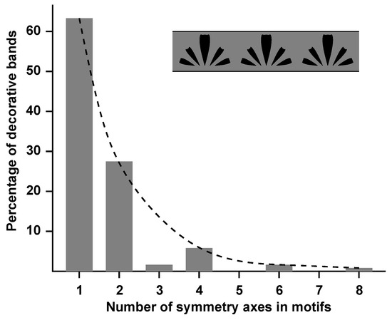 Decorative bands. The inset shows a decorative band consisting of a repetition of a 1-fold symmetrical motif. The histogram covers about 600 decorative bands containing motifs with 1–8 symmetry axes [37]. The dashed line indicates the rule—with notable exceptions—that motifs with more symmetry axes occur less often.