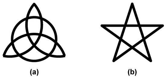 In mystical art, 3-fold and 5-fold symmetrical motifs—such as the triqueta and the pentagram (Figure 5)—have often been used to symbolize supernatural powers [38], and nowadays, such motifs are widely used in the emblems of police forces, armies, national flags, car brands, sports clubs, and so on. The pentagram is probably the all-time favorite, with a history of over 5000 years [39]. In ancient Greece, its alleged supernatural status led to the definition of the golden ratio as the ratio 1.618 in which each intersection of edges in a pentagram sections these edges (this ratio was believed to have aesthetical value, but see [40]). Furthermore, in ancient Mesopotamia, the pentagram symbolized imperial power; among Druids and Celts, it symbolized divine power; in medieval England, it was associated with knightly virtues; and in India, it features in Tantric art.