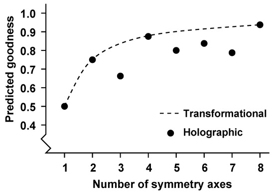 Predicted goodness (i.e., salience, or detectability) of n-fold symmetries with . The dashed line indicates the predictions by the transformational approach; the dots indicate the predictions by the holographic approach.