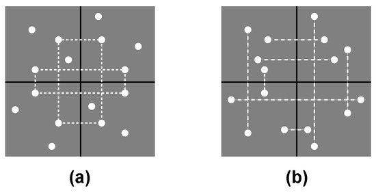 Schematic overview of Treder et al.’s [50] experimental conditions involving equally noisy 2-fold symmetries with and without correlation rectangles (the actual stimuli contained dots only; here, in both cases, correlation trapezoids are present but not highlighted); (a) Fifty percent of the elements are noise about both axes, and the other 50% are symmetrical about both axes, so that there are both correlation trapezoids and correlation rectangles; (b) Fifty percent of the elements are symmetrical about one axis but noise about the other axis, and vice versa for the other 50%, so that there are trapezoids but no rectangles.