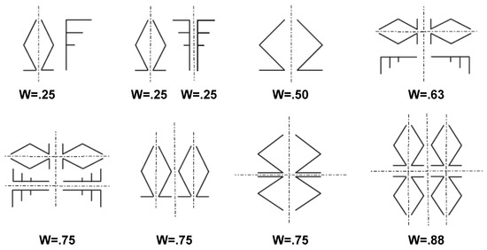 Compared to single symmetry, multiple symmetry has been less investigated, but the available empirical evidence is fairly consistent. As mentioned, as a rule, the detectability of multiple symmetry was found to increase with the number of symmetry axes—at least, if one compares 1-fold, 2-fold, and 4-fold symmetries [43,44,45]. Furthermore, to test the holographic approach, Nucci and Wagemans considered eight different combinations of global and local symmetries (Figure 11), and they asked participants to discriminate these from random patterns [64]. The holographic weights of evidence for these combinations ranged from for a local symmetry flanked by noise, to for a 2-fold symmetry with additional local symmetries, and they reported a correlation of between participants’ performance and W values. To the second combination in Figure 11, they assigned , but considering the task, this must be yielding a corrected correlation of (without this second combination, the correlation would be ).