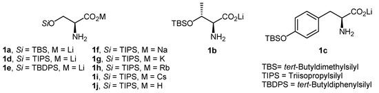 We then synthesized various siloxy amino acids and their alkali metal salts from L-serine, L-threonine (Thr) and L-tyrosine (Tyr) to perform a catalyst screen in cyclohexane (Table 2) [33,34,35,36,37,38,39,40]. Since L-serine derived catalyst 1a gave better results in both yield and enantioselectivity of 4a than did Thr(O-TBS)-OLi (1b) and Tyr(O-TBS)-OLi (1c), L-serine was selected as a basic amino acid and used for further modification of the catalyst (Table 2, entries 1–3). As for a silyl group, the triisopropylsilyl (TIPS) group was chosen as a protective group of the hydroxyl group of L-serine, since Ser(O-TIPS)-OLi (1d) gave a better enantioselectivity than did the TBS-protected catalyst 1a and also gave a much better yield of 4a than did a tert-butyldiphenylsilylated catalyst, Ser(O-TBDPS)-OLi (1e) (Table 2, entries 1, 4 and 5). Finally, we examined the effects of alkali metals of Ser(O-TIPS)-OM (1f–j) and found that the lithium salt catalyst 1d gave the best enantioselectivity as was found in our previous studies (Table 2, entries 4, 6–10) [33,41,42,43,44]. Since the Michael adduct 4a was obtained with high enantioselectivity in a moderate yield, catalyst 1d was chosen as a catalyst.