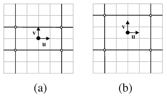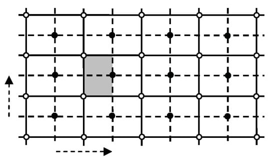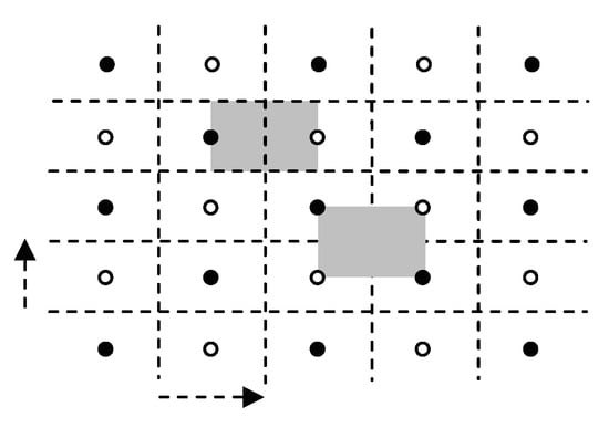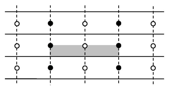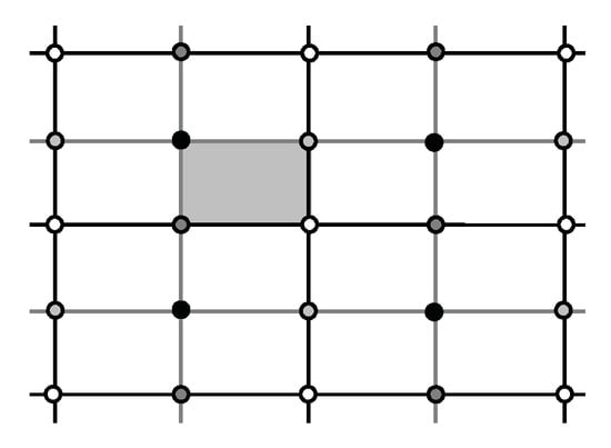 We begin by placing a black circle as a 2-fold center on a lattice of unit squares and call this the origin, then place orthogonal unit vectors and at the origin. There are two distinct positions, as shown in Figure 30. Next we place the two horizontal and vertical reflection axes nearest to the origin. The vertical axes go through , where x is a positive integer. The horizontal axes go through , with the following restrictions. When the origin is at a vertex of a unit square as in Figure 30a, y must be an even positive integer and when the origin is at the midpoint of an edge of a unit square as in Figure 30b, y must be an odd positive integer. The white 2-fold centers are at intersections of reflection axes placed reflection axes. The black and white 2-fold centers are inequivalent.