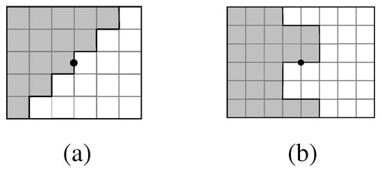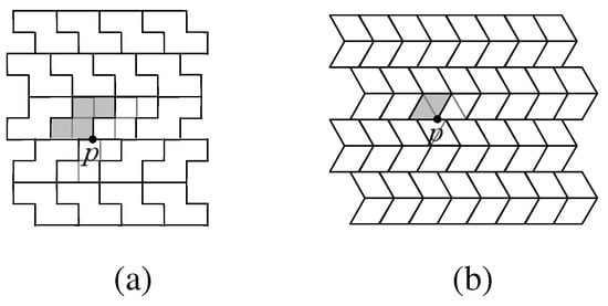In an isohedral tiling by polyomino (or polyiamond) tiles, there can be vertices p of the tiling at which the vertex of one tile T meets the edge of another tile at a point that is not a corner of a unit square (or unit triangle) in . When this is the case, if we look at the underlying tiling by units that make up the polyomino or polyiamond tiles, we will see that in the case of polyomino tiles, such a point p is a vertex of degree 3 in , and in the case of polyimaond tiles, such a point p is a vertex of degree 4 in . We will call such vertices displacement points of the tiling . The two tilings in Figure 2 have displacement points; in each, one displacement point has been labeled p.