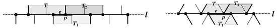 If a displacement point p exists in a tiling as described, then it is the vertex of a tile T in the tiling, and hence a vertex of a unit square (or triangle) that meets the interior of an edge e of another unit square (or triangle) in an adjacent tile , as illustrated in Figure 2 and Figure 3. Let l be the line on which e lies. Since the unit squares (triangles) in the polyomino (polyiamond) tiles meet edge-to-edge, e is part of an edge of T and also part of an edge of two other adjacent tiles and ; edges of all three tiles must lie on l. The vertices of T, , and on l must also be displacement points. Repeating the argument for tiles adjacent to T, , and and so on, it follows that the line l contains an infinite number of displacement points, and l is the union of edges of tiles whose vertices are these displacement points. Further, these successive displacement points along l forbid other displacement points on lines in that are not parallel to the line l. Thus all lines containing displacement points must be parallel. ☐
