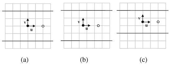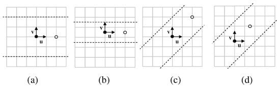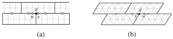 When is as in Theorem 4, we denote by the least distance between a slide point q and a corner v of a unit square (or unit triangle) on the slide line containing q (see Figure 6 for an illustration). Then , where s is the length of an edge of a unit square (or triangle) in T. The tiling has no displacement points if and only if . An -slide operation on that moves q to v will align all unit squares (or unit triangles) that meet the slide line, and the resulting tiling will have no displacement points. In fact, for every integer k, and , an -slide will produce a tiling with no displacement points, and these are the only values of for which this is possible. (When k is negative, the slide will be in the direction from v to q.) So except for a countable number of values of , an -slide operation will move displacement points in to new displacement points in .