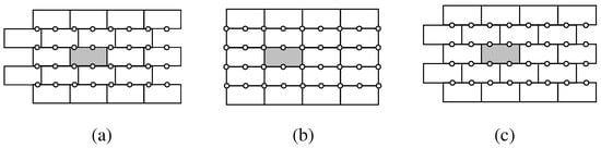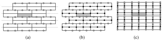 Type 2 isohedral tilings by bricks that are m unit squares high and n unit squares wide. One brick (shaded) is a fundamental domain for the group G generated by 2-fold centers marked by white circles. The tilings are related by an -slide operation. (a) One tiling in an uncountably infinite family of tilings in general position; all are the same topological type and have pmg symmetry group; (b) 2-fold centers coincide with vertices and midpoints of edges of the bricks; . The tiling has pmm symmetry group unless , when it is type p4m; (c) 2-fold centers and slide points are equispaced along the slide lines. When n is even, ; when n is odd . The symmetry group is type cmm.
